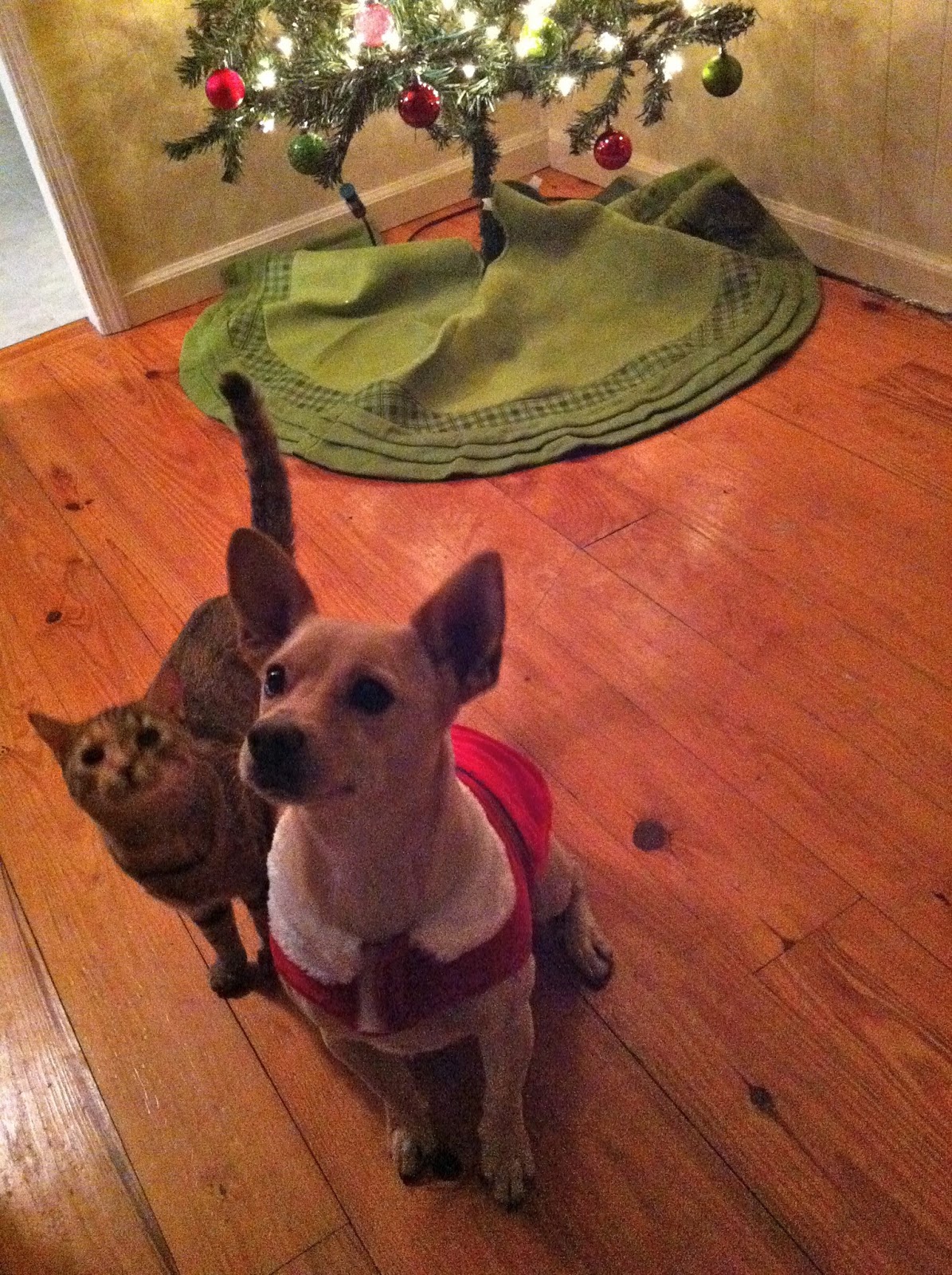 I have to say, though, one of the most fun gifts was Jack's present--an adorable Santa suit! Last night when I attempted to take pictures of the suit, Jack wasn't cooperating. As a bribe, Thomas took the opportunity to give him his heartworm pill (in a hearty spoonful of peanut butter of course). Here are the antics that ensued: